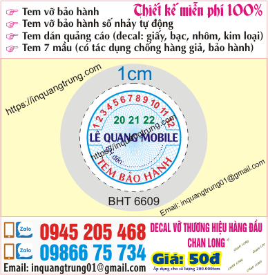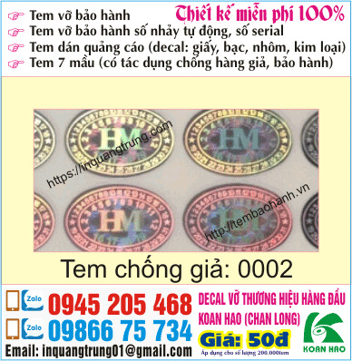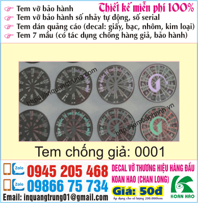 - Công ty In Quang Trung cung cấp dịch vụ thiết kế và in tem bảo hành, tem vỡ , tem bể, tem rách, tem nhãn decal giá rẻ nhất. Ngoài ra chúng tôi còn cung cấp tem nhãn mác uy tín tại Bắc Ninhcác loại như: Tem chống hàng giả, tem decal giấy, tem decal nhựa, tem decal bạc, tem dán quảng cáo, tem dán đuôi ô tô….