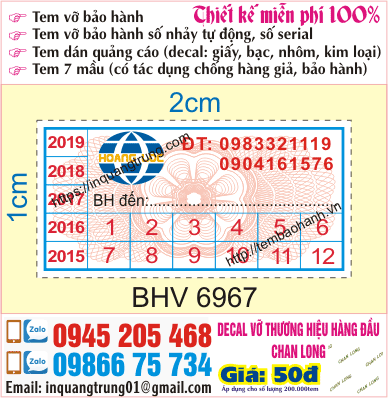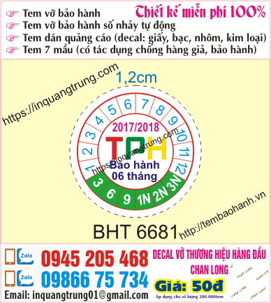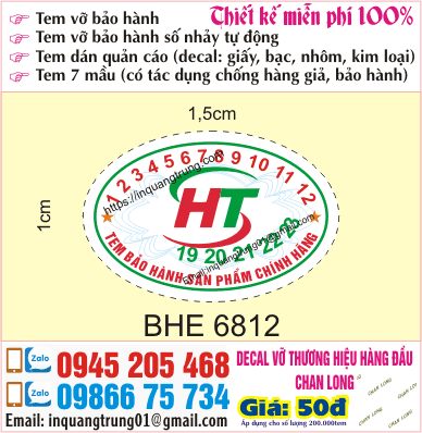 - Để thuận tiện cho quý khách trong việc lựa chọn mẫu thiết kế phù hợp. Chúng tôi luôn cập nhật những mẫu thiết tem bảo hành, tem chống giả mới nhất, đẹp nhất, tiện dụng nhất trên hệ thống web của In Quang Trung. Tất cả các mẫu đều được gán ký hiệu (ví dụ: BHT 6677) rất thuận tiện cho quý khách trong việc liên hệ đặt hàng. Hy vọng quý khách sẽ quảng bá website tới bạn bè người thân đang có nhu cầu in tem bảo hành tại Bắc Ninh.